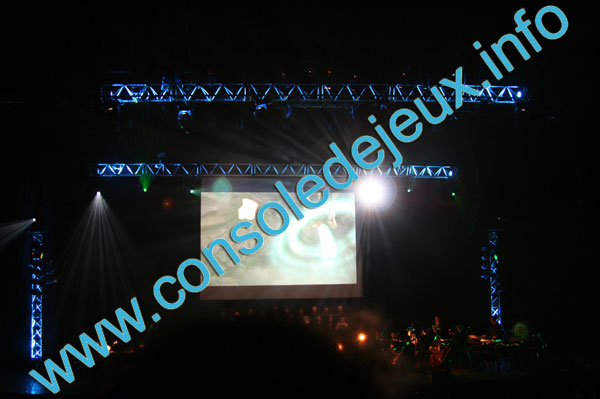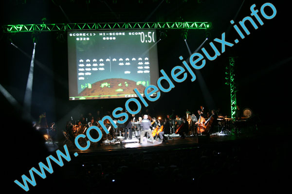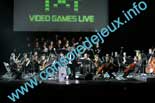 Vidéo Games Live est le plus grand concert de musiques de jeux vidéo. Pour la première fois en France, vous avez pus assister le 18 décembre 2008 au Palais des Congrès de Paris. Succès mondial enfin à Paris ! De Tetris à Tron, de Castlevania à God of war, la musique des plus grands jeux vidéos de tous les temps en concert et également en CD audio (créé par Tommy Tallarico et Jack Wall). Organisation de la soirée :Le Palais des Congrès était plein avec environ 3 400 personnes ! Le spectacle commençait à 20H30 mais à partir de 19H30, juste avant de rentrer dans la salle de spectacle on pouvait tester les anciennes consoles de jeux vidéos grâce à Game One, participer à un concours sur Guitar Hero, et découvrir le Cosplay. Vous ne verrez pas de photos de la première partie car je suis arrivé trop tard. 20H30 précise, le spectacle allait commencer, tout le monde entre dans la salle du Palais des Congrès, tout le monde avait des places numérotées pour suivre le concert. Video Games Live :Sur la scène on peut compter une vingtaine de choristes et une vingtaine de musiciens, un chef d'orchestre et + Tommy qui parle au micro entre les chansons et joue également de la guitare... Au millieu le chef d'orchestre avec devant lui les choristes et sur les côtés les musiciens. Juste au dessus de la scène un écran géant pour montrer les vidéos des jeux vidéos selon les musiques jouées. Un spot éclaire la scène et l'on voit un carton avancer tout seul puis le présentateur va surgir du carton et présenter le spectacle, le Video Games Live va commencer. Pour créer l'ambiance au bout de deux chansons un petit jeu va être lancé, au micro une demande pour savoir qui voudrait participer... Une partie de Space Invader un peu spécial va démarrer... Le joueur enfile un t-shirt Space Invader dans lequel se trouve un capteur, pour déplacer le vaisseau c'est le joueur qui devra se déplacer.
